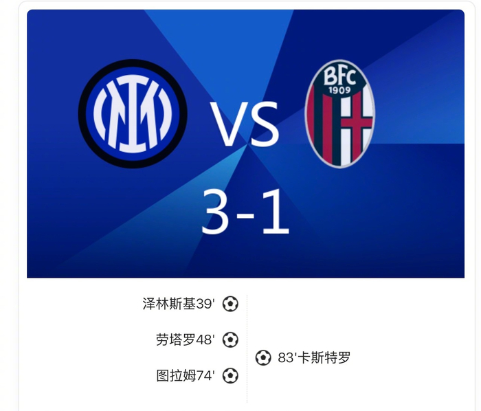【战报:国米3-1博洛尼亚,劳塔罗传射,图拉姆破门】凭借图拉姆、泽林斯基、劳塔罗的进球,国际米兰3-1战胜了博洛尼亚。