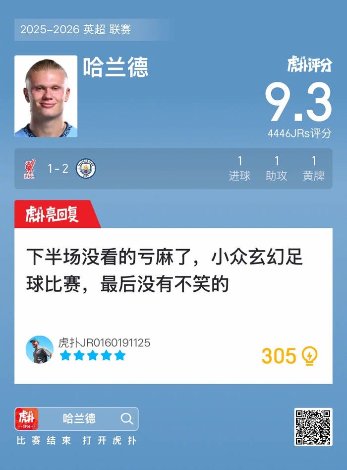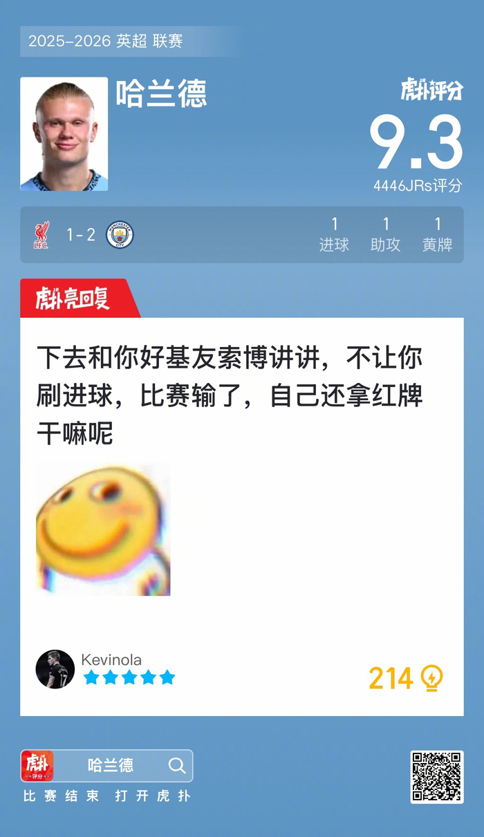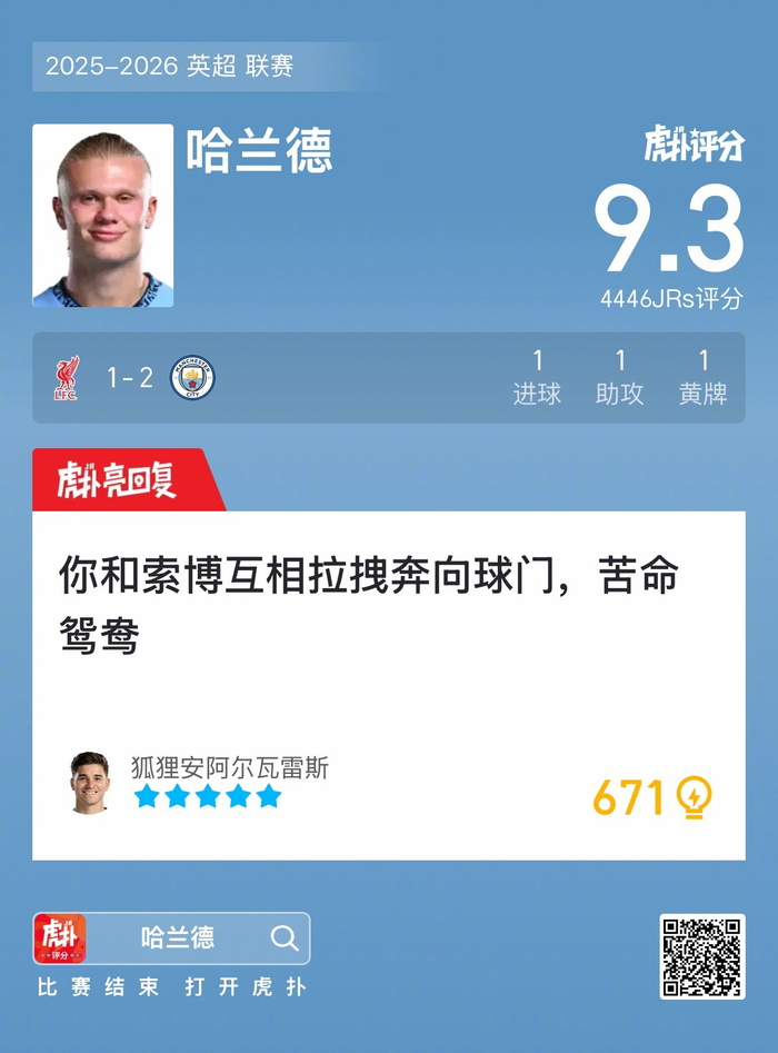 #利物浦1比2曼城#哈兰德打进一球贡献一次扑救,这发挥你给几分?
