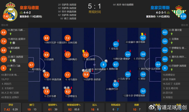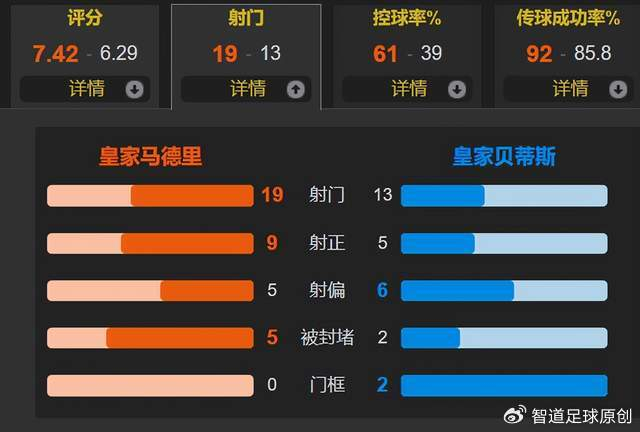 全场比赛,皇马的控球率为61%,一共有19次射门,其中9次射正;贝蒂斯一共有13次射门,其中5次射正。