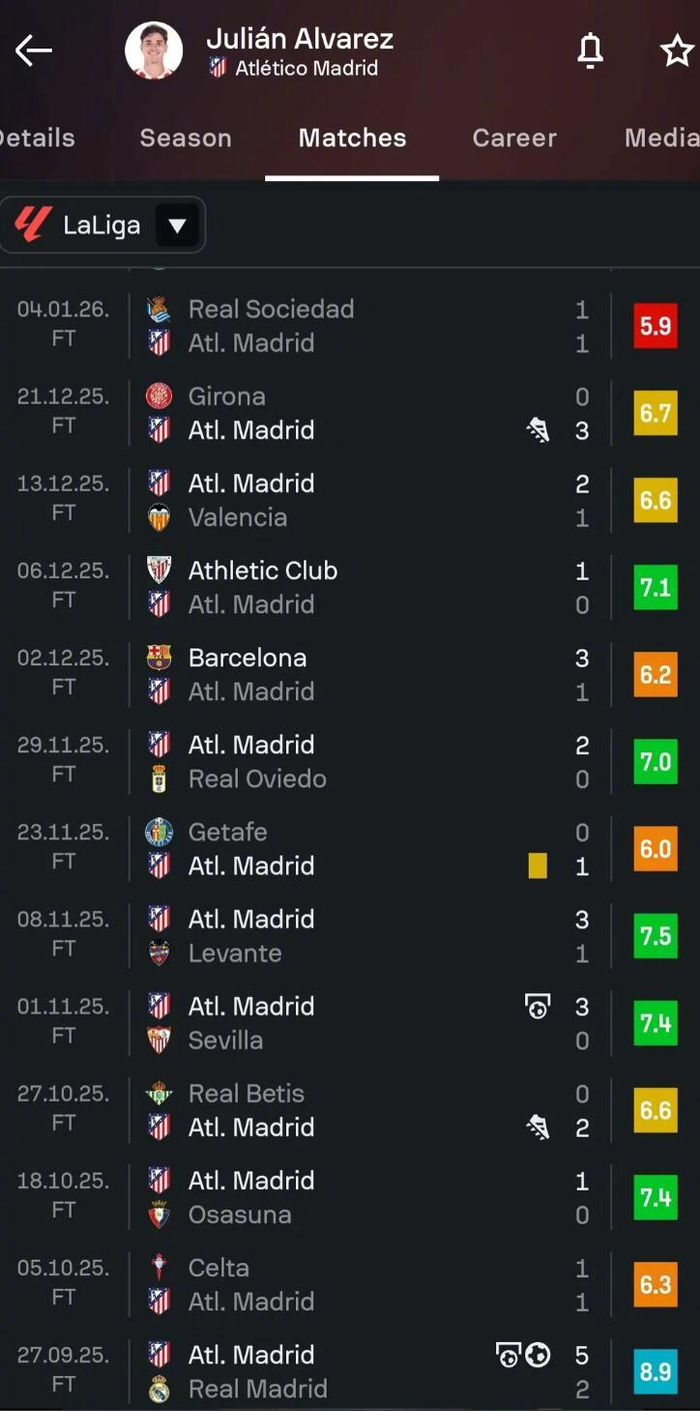 阿尔瓦雷斯最近12场西甲联赛颗粒无收,只有过1次助攻,这是阿根廷前锋旅欧生涯最长的联赛球荒纪录。上一次阿尔瓦雷斯在西甲联赛取得进球,还是在去年11月——马竞3-0战胜塞维利亚的比赛里。