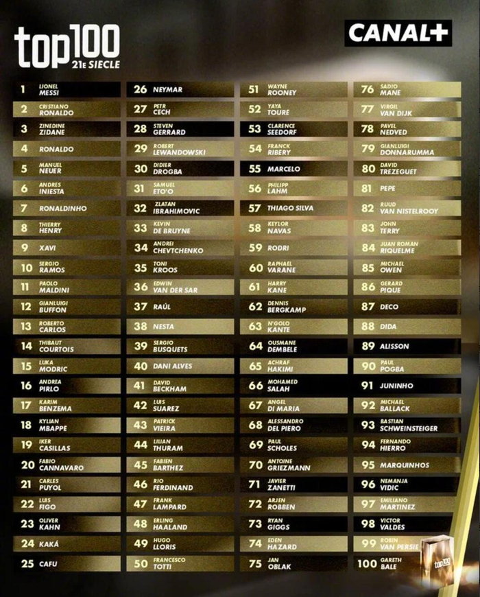 法国CANAL+电视台公布了21世纪前25年的百大球星评选结果。该评选的团队由专业记者、前著名职业球员组成,他们选出了从2001年到2025年的100名顶级足球运动员,最终结果如下: