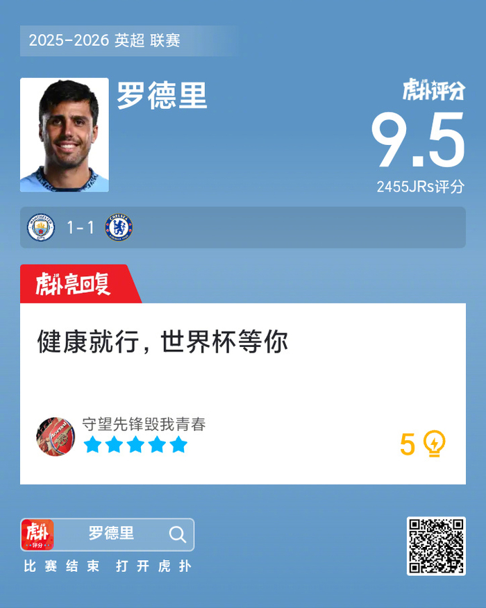 #曼城1比1切尔西# 罗德里赛后收获9.5的虎扑评分!