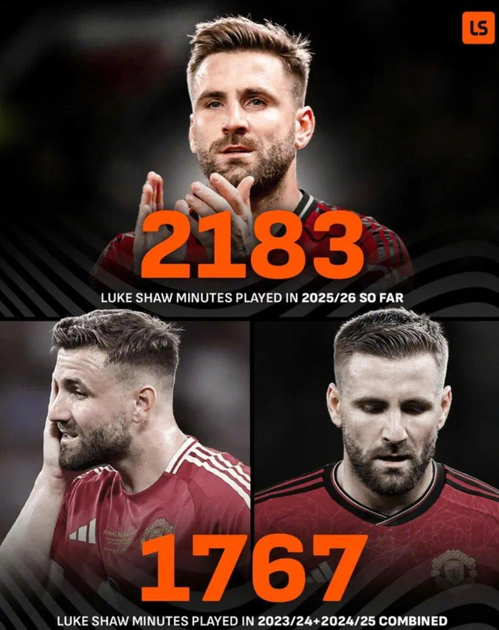 卢克肖本赛季目前的总出场时间,已经超过他在2023/24与2024/25两个赛季合计的1767分钟。在经历伤病与断断续续的出场之后,卢克-肖的“状态回归”无疑为曼联左路提供了更可靠的保障。
