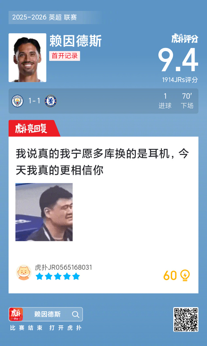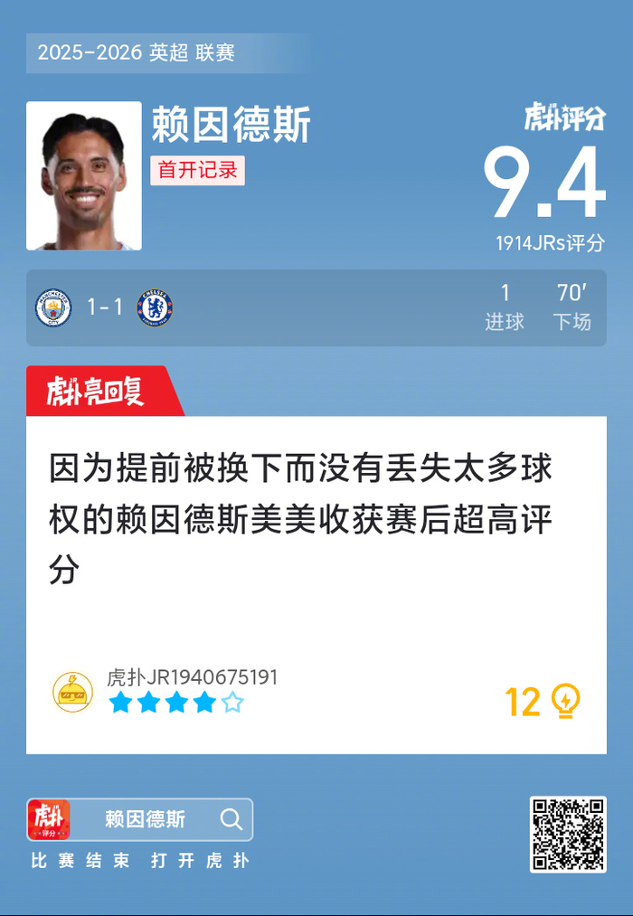#曼城1比1切尔西# 赖因德斯打进一球,赛后收获9.4的虎扑评分!