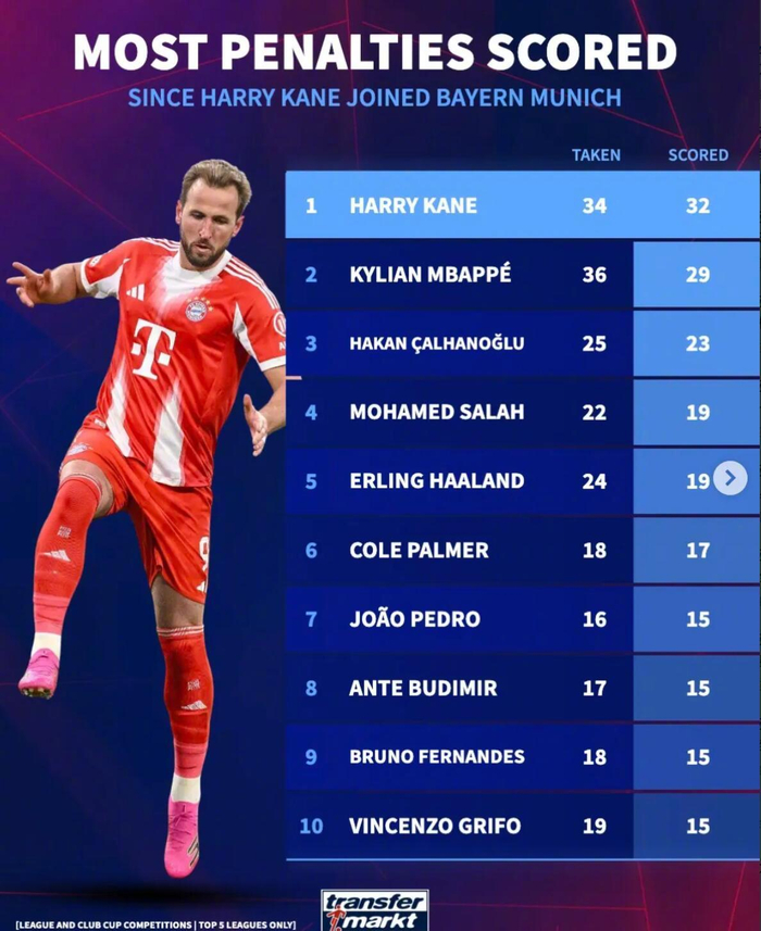 凯恩34次主罚点球打进32球居首;姆巴佩主罚36次进29球排第二;恰尔汗奥卢主罚25次进23球排第三。