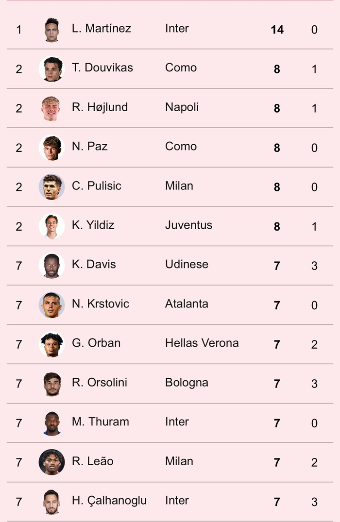 【意甲射手榜】 2025-26赛季#意甲联赛# 第24轮射手榜。👟#sempremilan#