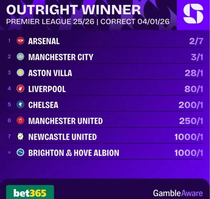 而著名媒体Squawka也统计了本赛季英超夺冠赔率,阿森纳仍然领跑,曼城第二,维拉第三。