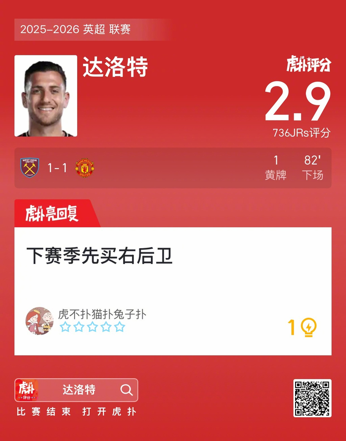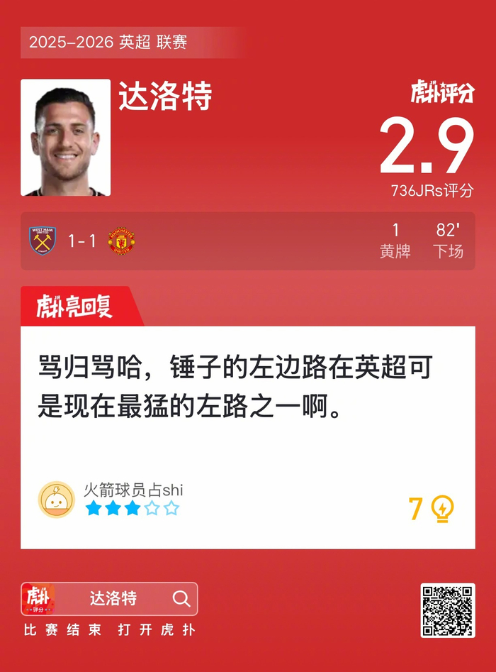 #西汉姆联1比1曼联#达洛特吃到一张黄牌,赛后收获2.9的虎扑评分!