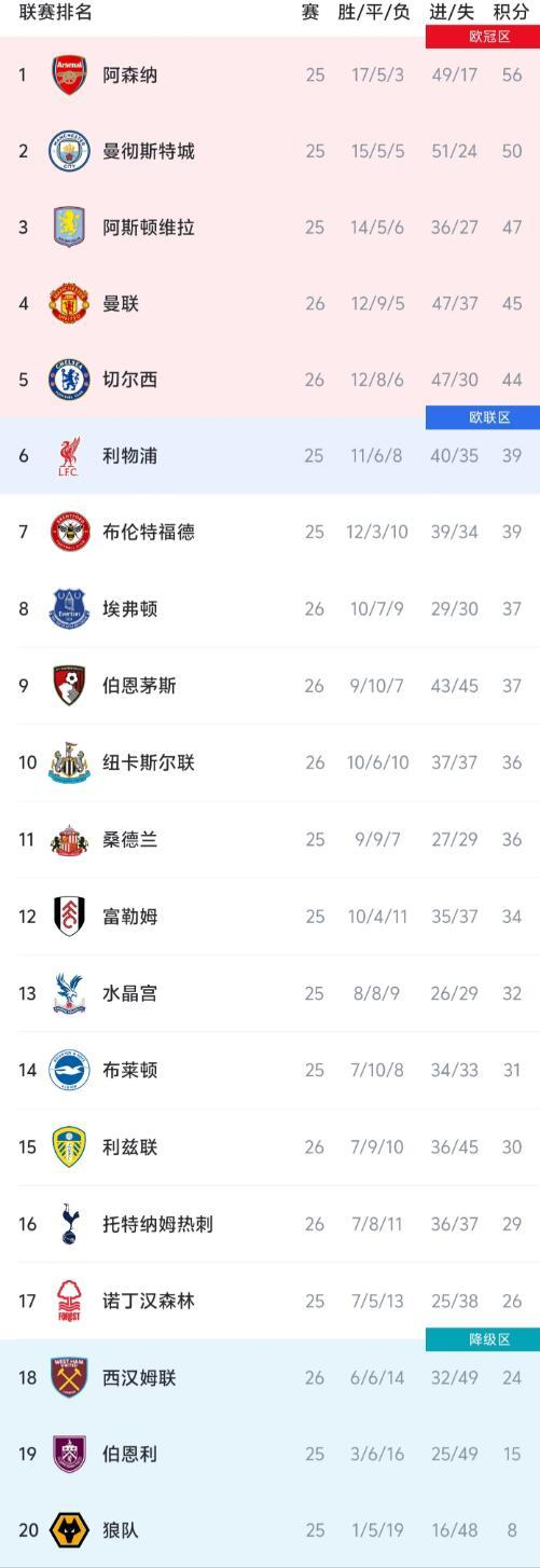 在今夜的英超比赛结束后,积分榜形势迎来了变化。