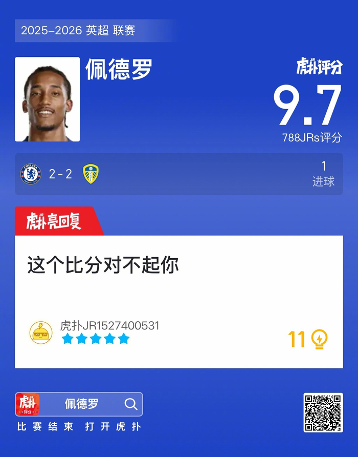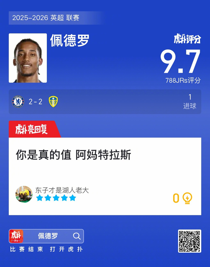 #切尔西2比2利兹联#佩德罗打进一球,赛后收获9.7的虎扑评分!