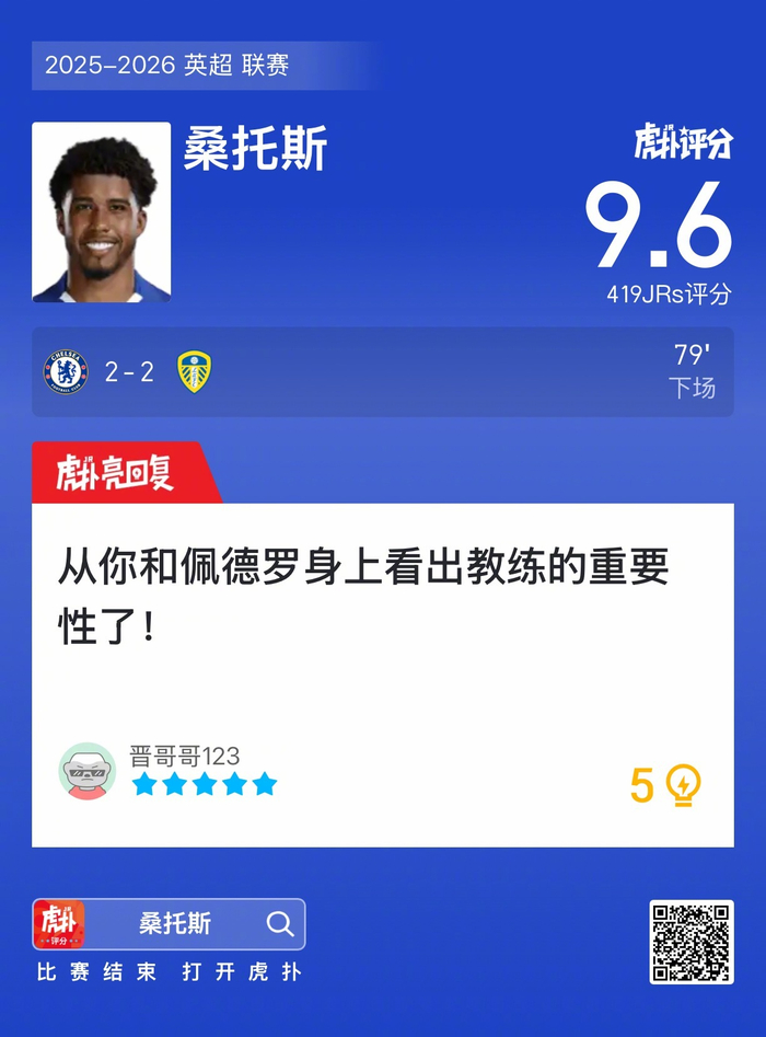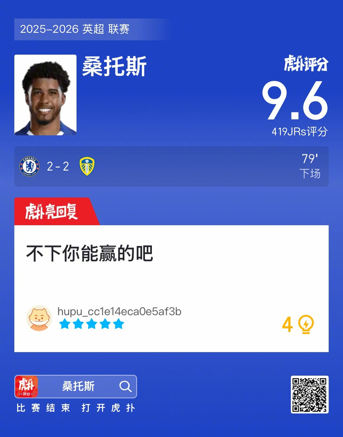 #切尔西2比2利兹联#桑托斯赛后收获9.6的虎扑评分!