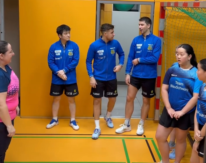 因为这场比赛是萨尔布吕肯的主场比赛,在比赛开启之前俱乐部还进行了一些小游戏,樊振东站在一旁搓着小手,一旁的大妈让小球迷们上前给运动员交流乒乓球经验。