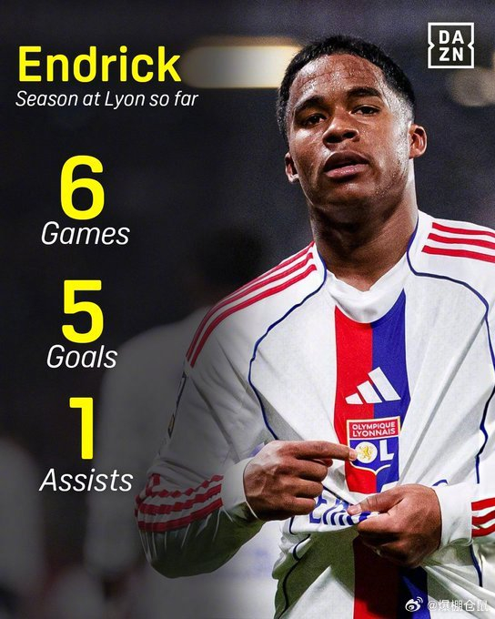 【6场5球1助攻1红牌】里昂技术总监确定,恩德里克在里昂的出场次数越多,球队向皇马支付的租借费就越少,这是多赢的局面:球员获得了锻炼经验,里昂获得了一个强力前锋,皇马收了一笔租借费。