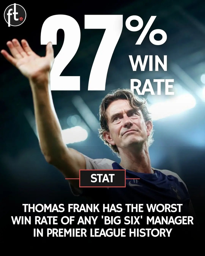 据统计,托马斯-弗兰克创下了英超历史Big6俱乐部主教练最低胜率纪录: