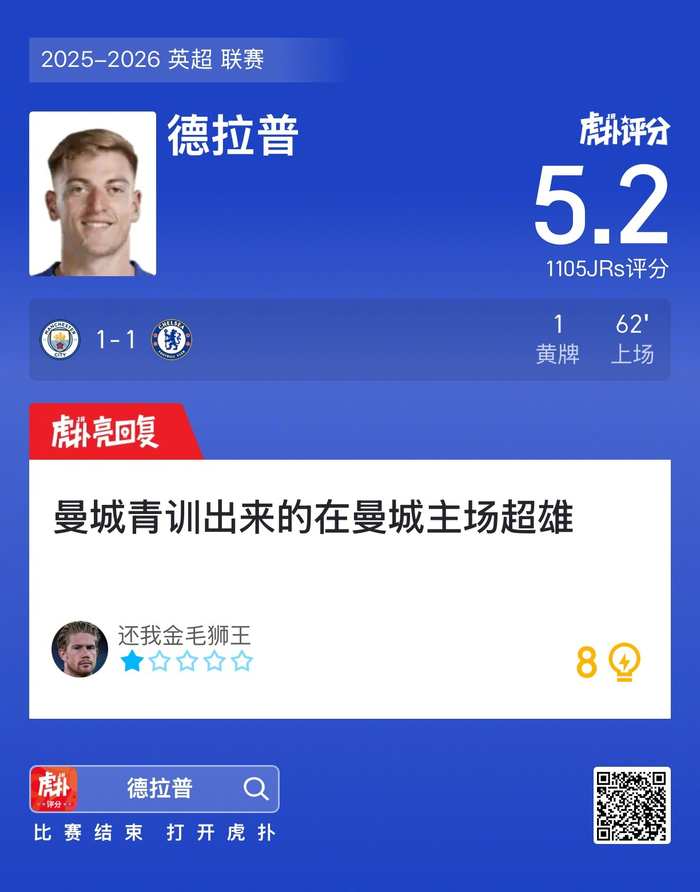 #曼城1比1切尔西#德拉普吃到一张黄牌,赛后收获5.2的虎扑评分!