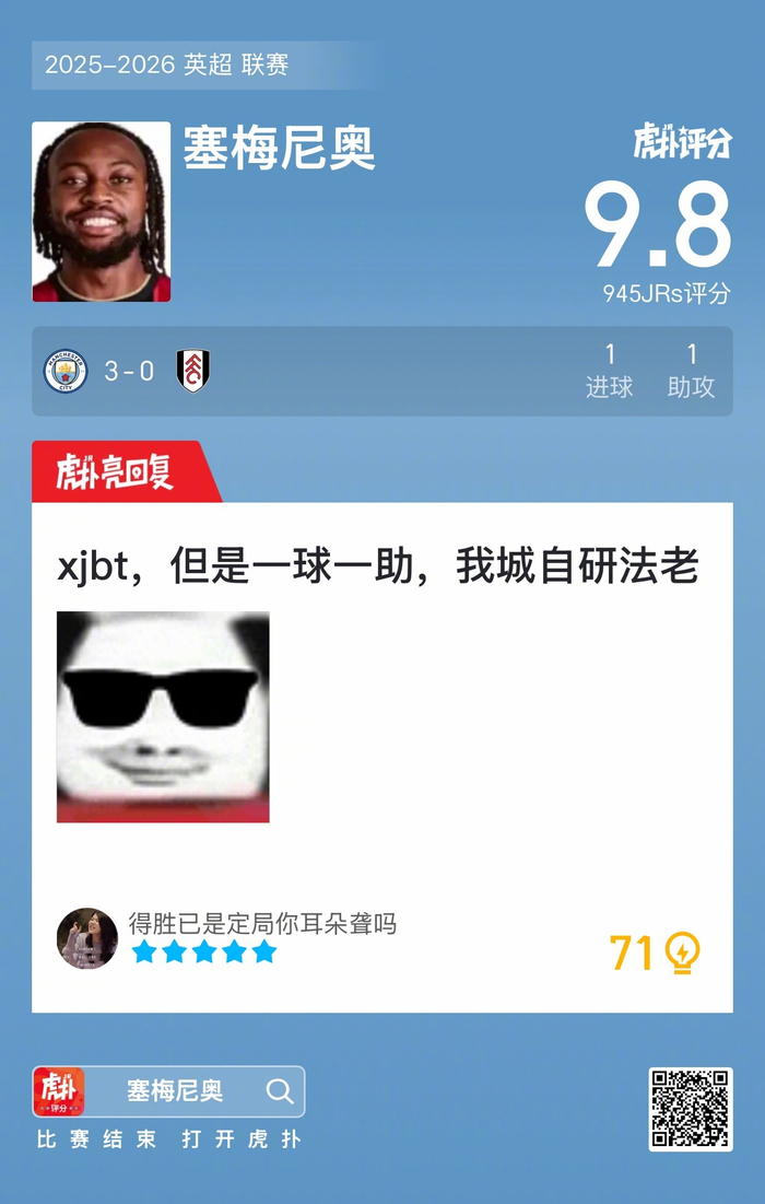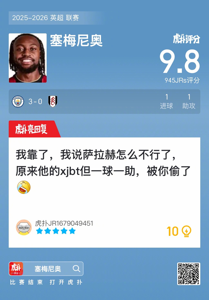 #曼城3比0富勒姆#塞梅尼奥打进一球贡献一次助攻,赛后收获9.8的虎扑评分!