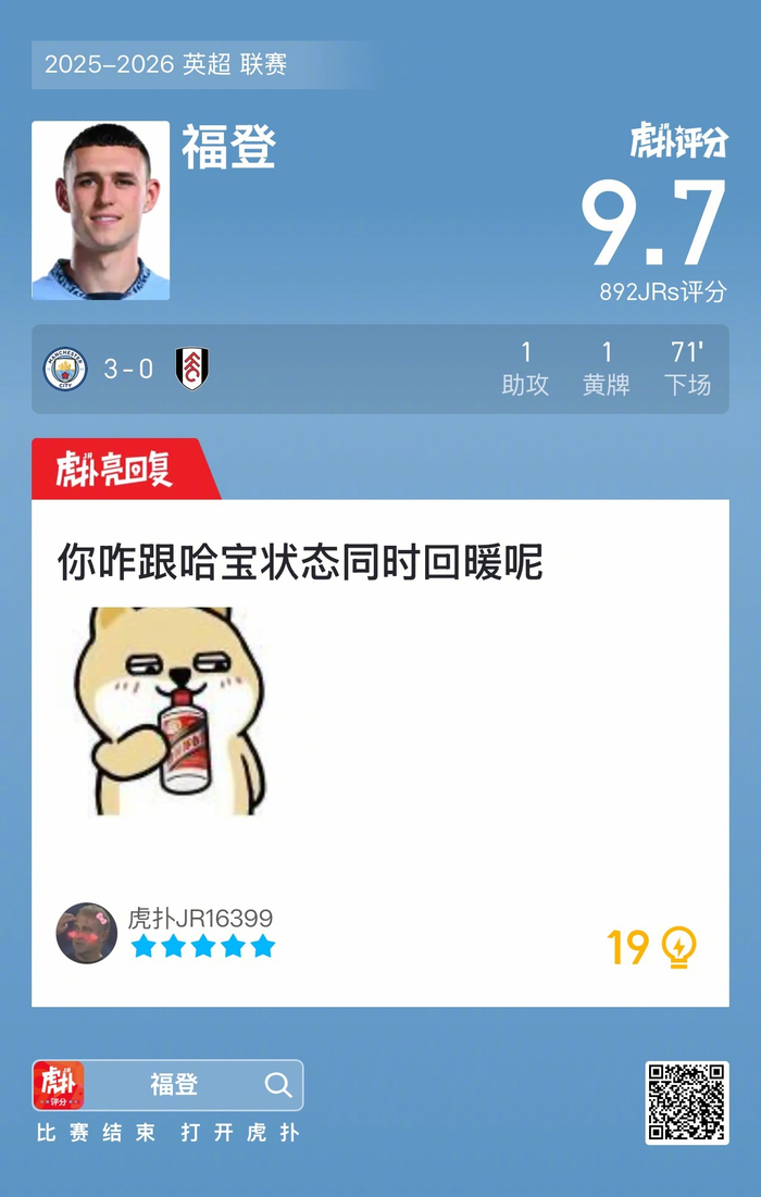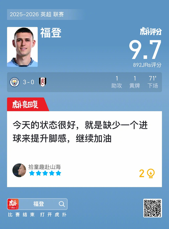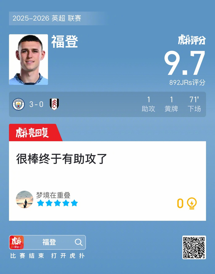 #曼城3比0富勒姆#福登贡献一次助攻,吃到一张黄牌,赛后收获9.7的虎扑评分!