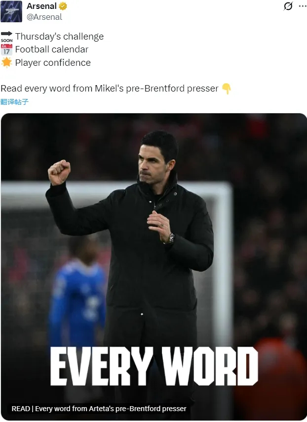 阿尔特塔出席了赛前新闻发布会,我们来看看阿森纳主帅的发言。