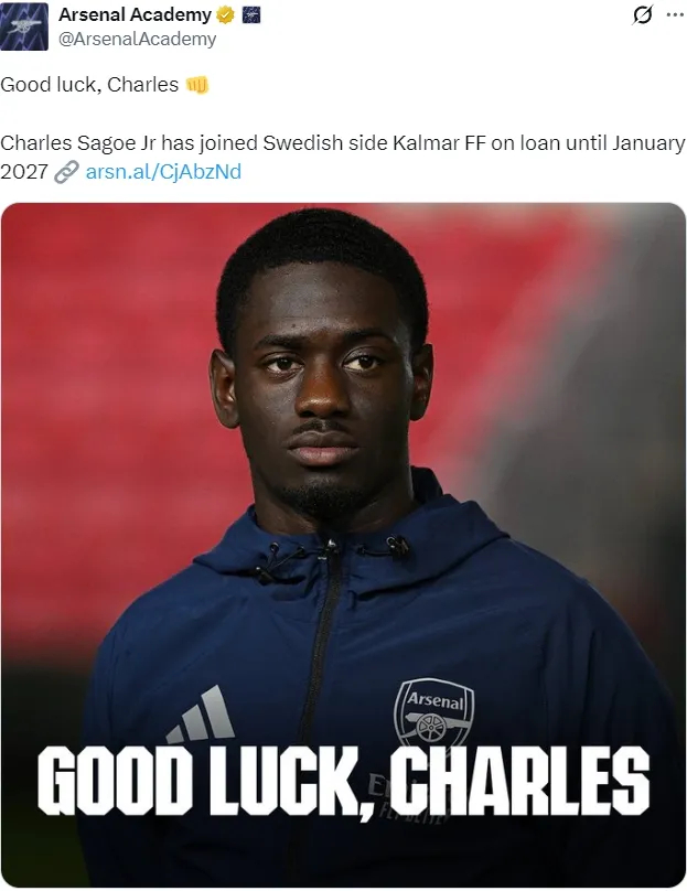 官方:阿森纳宣布查尔斯-萨戈租借加盟瑞典俱乐部卡尔马FF直到2027年1月。