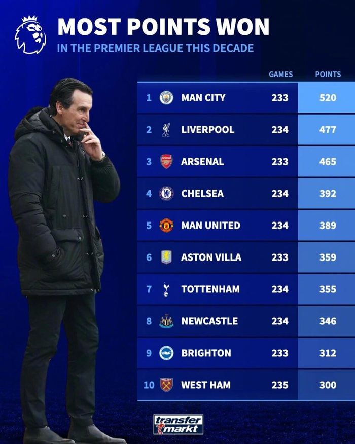 德转统计了自2020年以来,英超球队积分榜。
