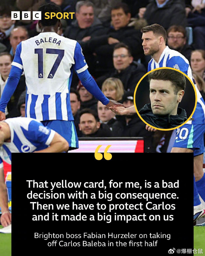 【保护性换下】布莱顿中场巴莱巴在对阿斯顿维拉的比赛中吃到黄牌,第22分钟就被换下,主教练许尔策勒表示这是为了保护球员:“裁判的黄牌绝对是错误判罚,这不是严重犯规却给了黄牌。我必须保护巴莱巴,这是换下他的唯一原因。我在英超联赛中见过无数次这样的犯规,99%的情况下你不会出示黄牌,因此我真的很不理解。”