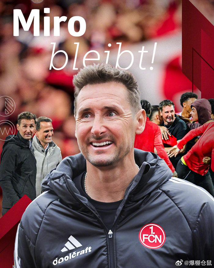 【官方】德乙纽伦堡与主教练克洛泽续约,本赛季初球队5战仅仅拿到1分,他差点就下课,好在缓过来了,目前球队26分排名德乙第10。
