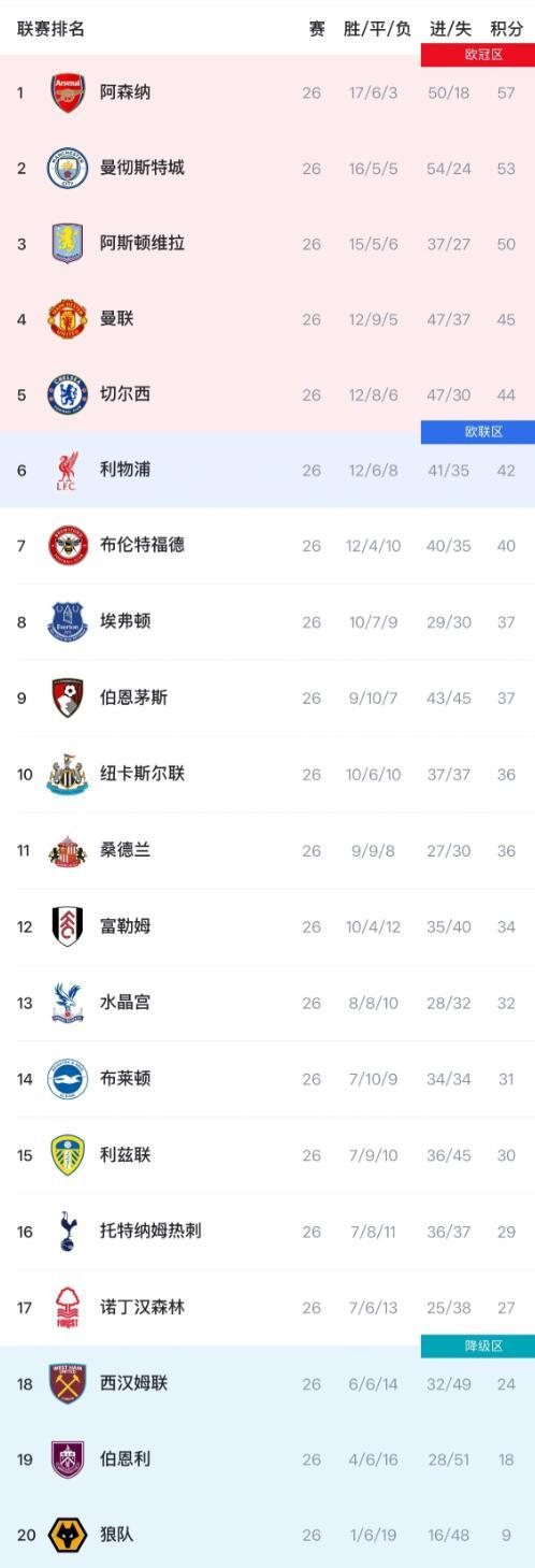 英超第26轮战罢,最新积分统计显示,阿森纳仍稳居榜首,积57分领先曼城(53分)与阿斯顿维拉(50分)。曼联、切尔西、利物浦分列第四第五第六。降级区方面,西汉姆联、伯恩利、狼队积分垫底,正为保级苦战。