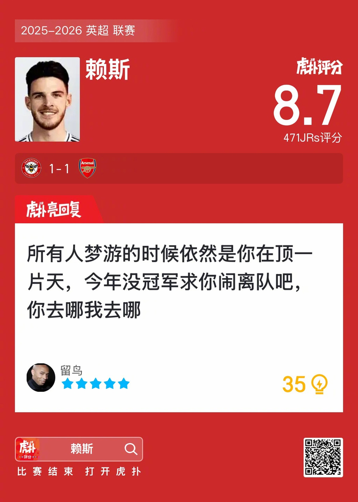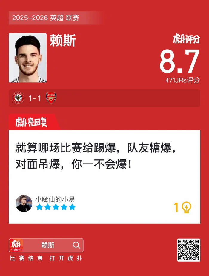 #布伦特福德1比1阿森纳#赖斯赛后收获8.7的虎扑评分!