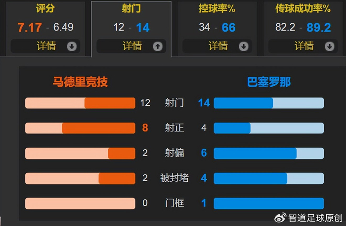 全场比赛,马竞的控球率为34%,一共有12次射门,比巴萨的14次少了2次,但马竞有8次射正,是巴萨4次的2倍。