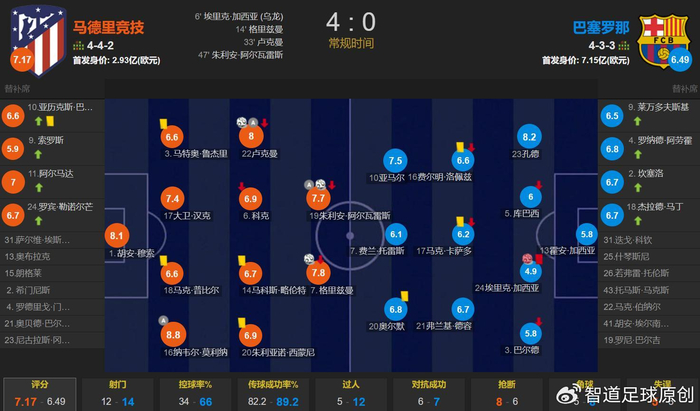 此役巴萨进攻和防守都不行,费兰真是一位连吃饼都吃不明白的前锋,不知道为什么能在巴萨长期踢球,这就是巴萨管理层的重大失误。巴萨后防线更是一塌糊涂,此役三位后防线首发的球员评分不合格,低于6分,分别是左后卫巴尔德、左中卫加西亚-埃里克以及门将霍安-加西亚。巴萨进攻没有终结者,左路的防线又是漏洞百出。马竞半场就4球横扫了巴萨,新援卢克曼增强马竞冲击力,与阿尔瓦雷斯双双传射建功,老将格列兹曼也取得进球。国王杯半决赛首回合,马竞4-0横扫巴萨,这4球都是11打11的情况下半场取得的,由此可见此役巴萨是多差劲,因为红蓝军团没了阵眼佩德里,巴萨就直接降了一个档次。