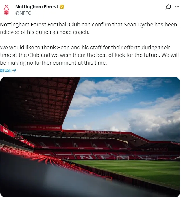 官方:诺丁汉森林宣布解雇了肖恩-戴彻,这名教练仅仅上任了4个月左右。