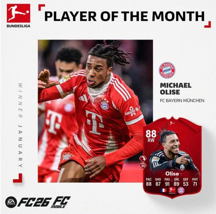 德甲官方消息,拜仁边锋奥利塞当选联赛1月最佳球员。