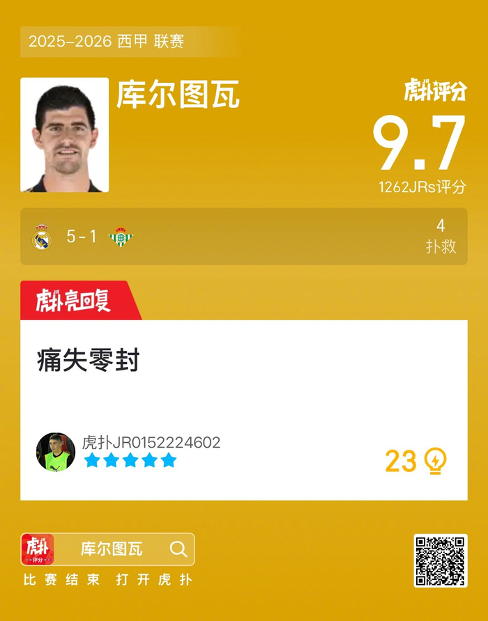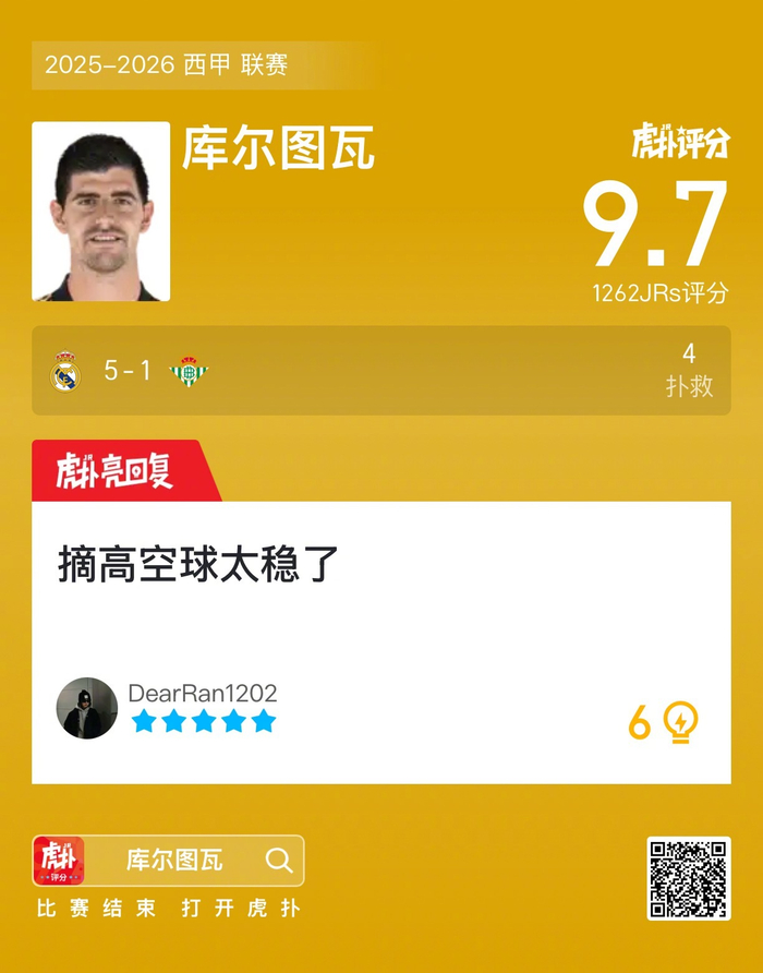 #皇马5比1皇家贝蒂斯#库尔图瓦贡献四次扑救,赛后收获9.7的虎扑评分!