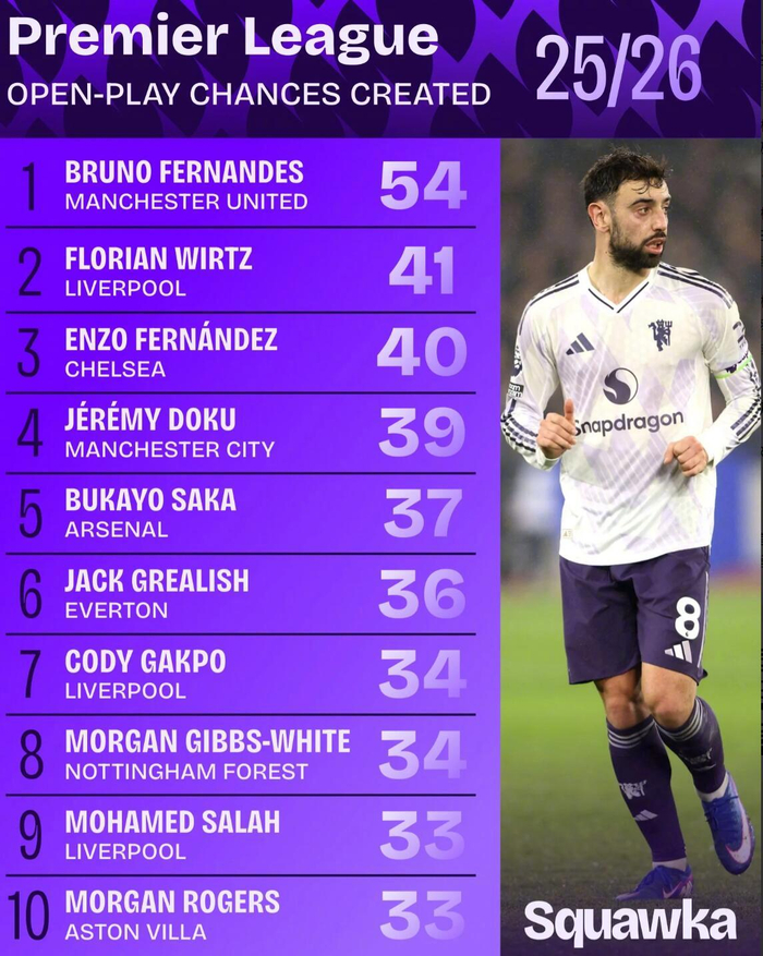 日前著名统计网站Squawka公布了本赛季英超运动战中创造机会最多的球员,B费断层领跑,维尔茨紧追其后,利物浦3人进前10。具体榜单如下: