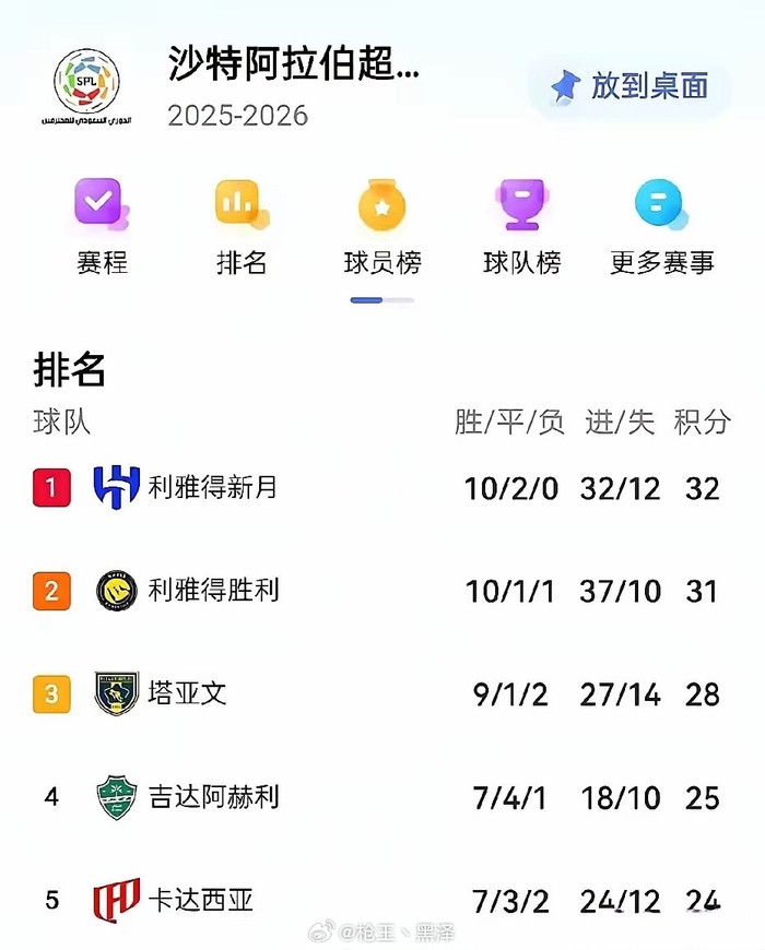 沙特联赛的第12轮全部结束,利雅得新月在客场赢球,从而以10胜2平的不败战绩,在积分上反超利雅得胜利,成功升至榜首。