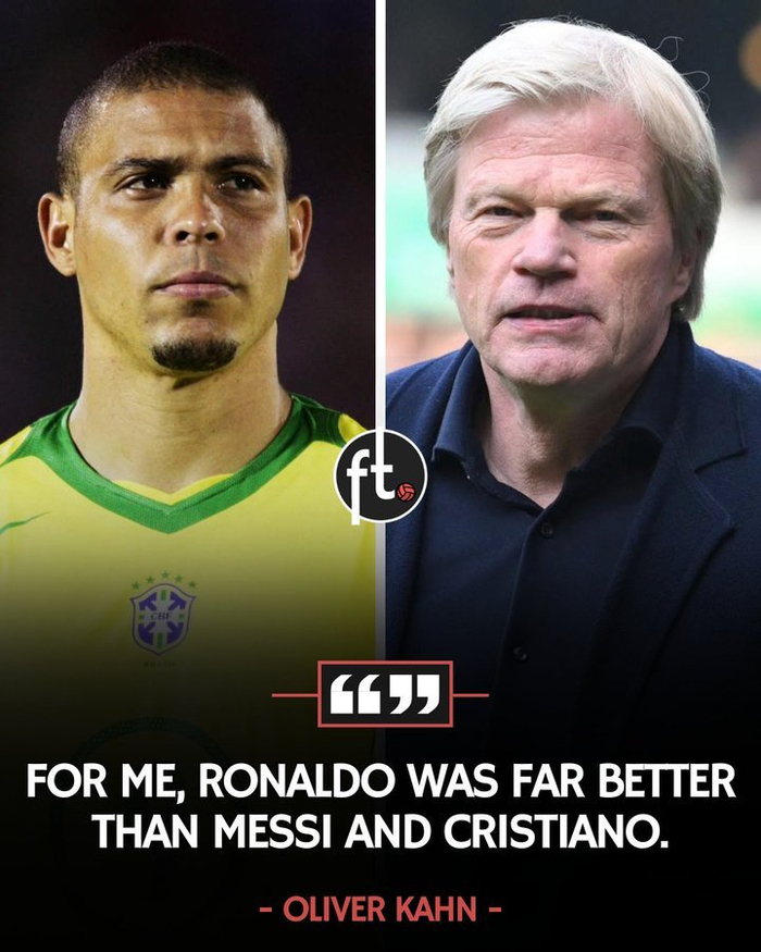 前拜仁慕尼黑门将奥利弗·卡恩谈GOAT(史上最佳球员)之争:“对我来说,罗纳尔多远胜于梅西和C罗。我仍然认为他是史上最全面的球员。这位巴西天才是我见过的最伟大的球员。”