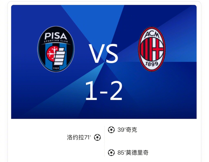 战报:#比萨1比2AC米兰#,魔笛绝杀,菲尔克鲁格失点!