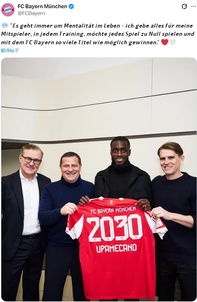 官方:拜仁宣布和乌帕梅卡诺续约到了2030年,这名27岁的中卫此前的合同今年夏天到期。