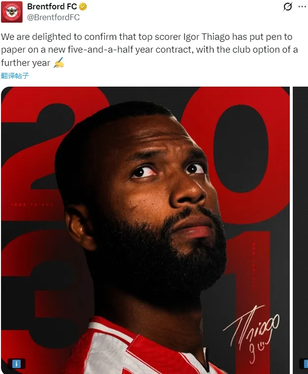 官方:布伦特福德宣布和伊戈尔-蒂亚戈签下了一份2031年到期的新合同,附带延长一年条款。