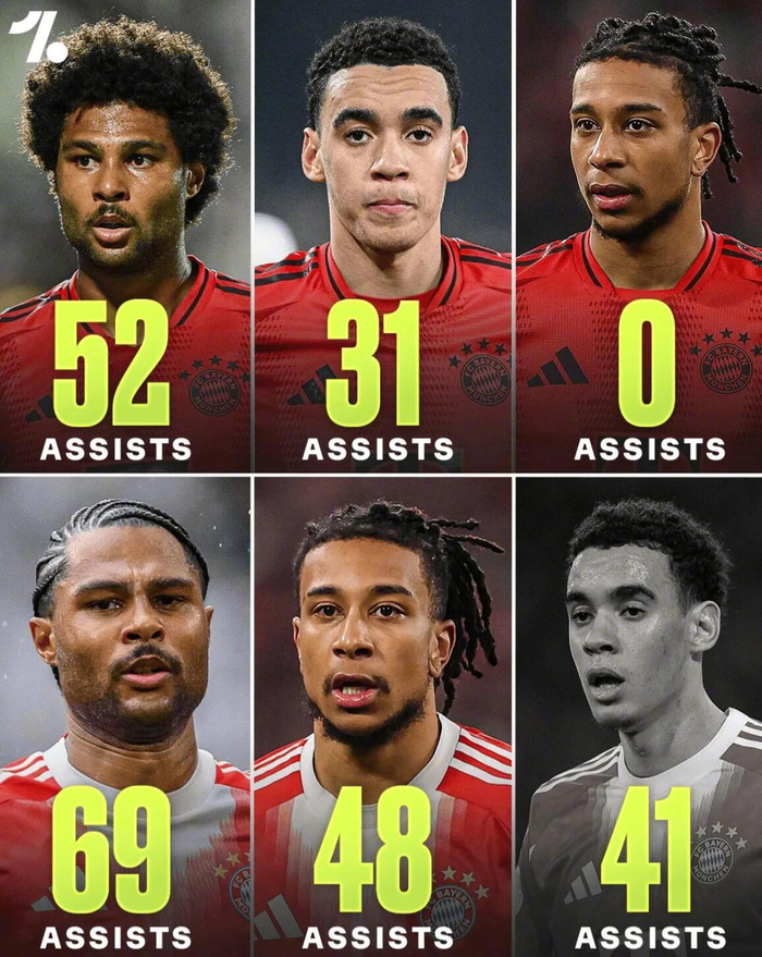 目前,奥利塞已经为拜仁贡献了48次助攻。