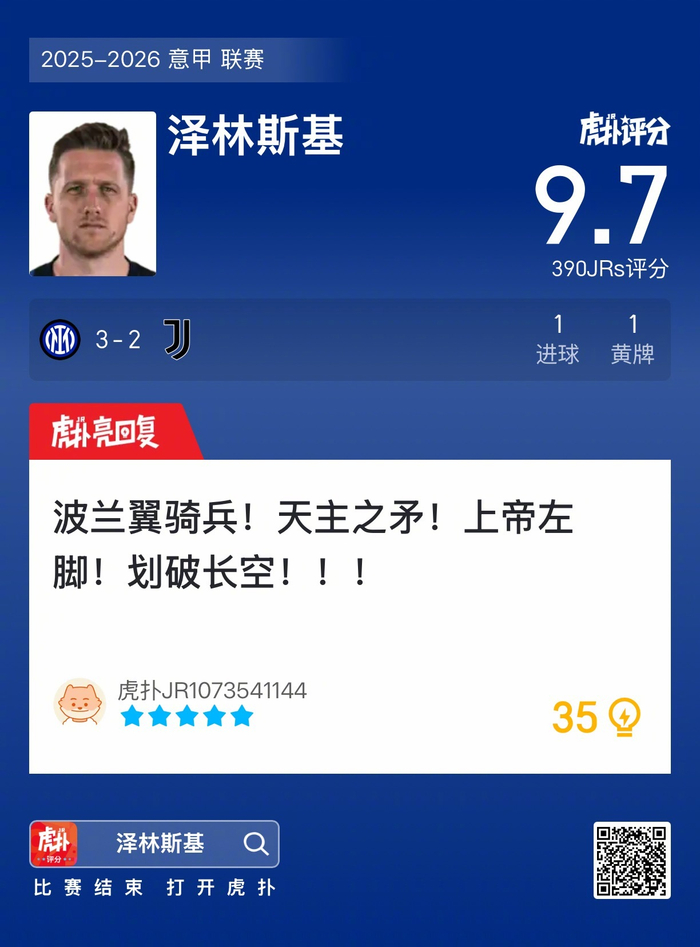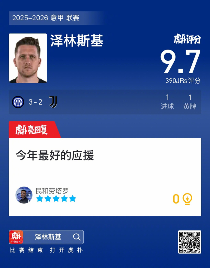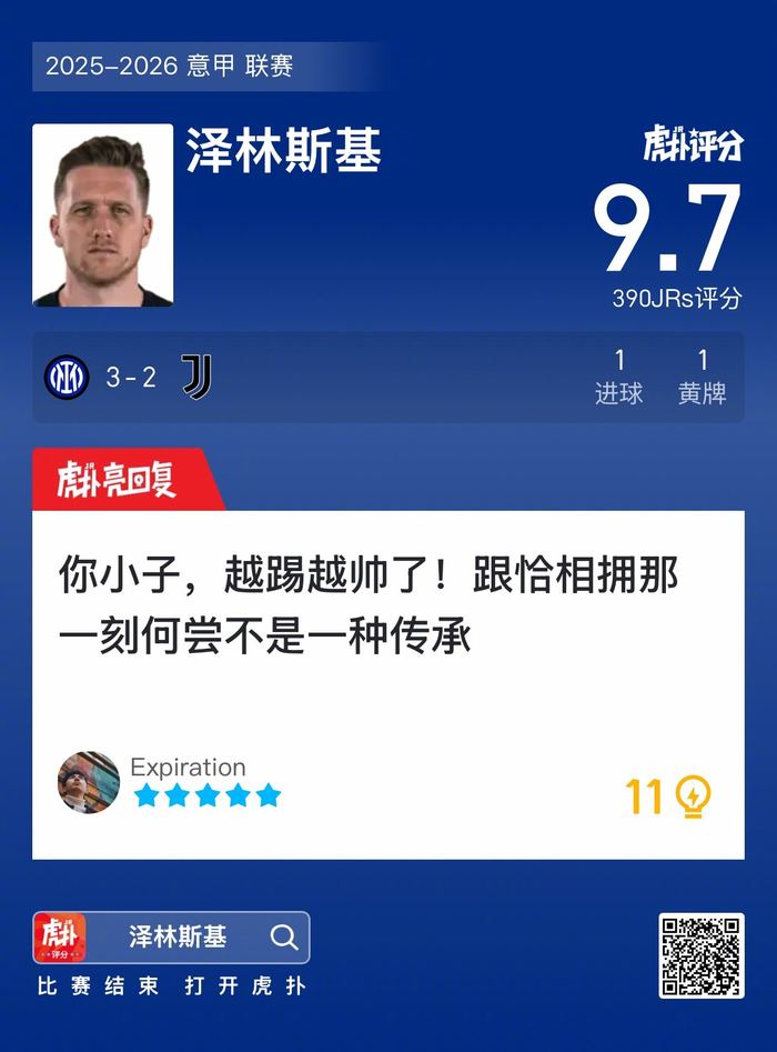 #国际米兰3比2尤文图斯#泽林斯基打进一球,这表现你给几分?