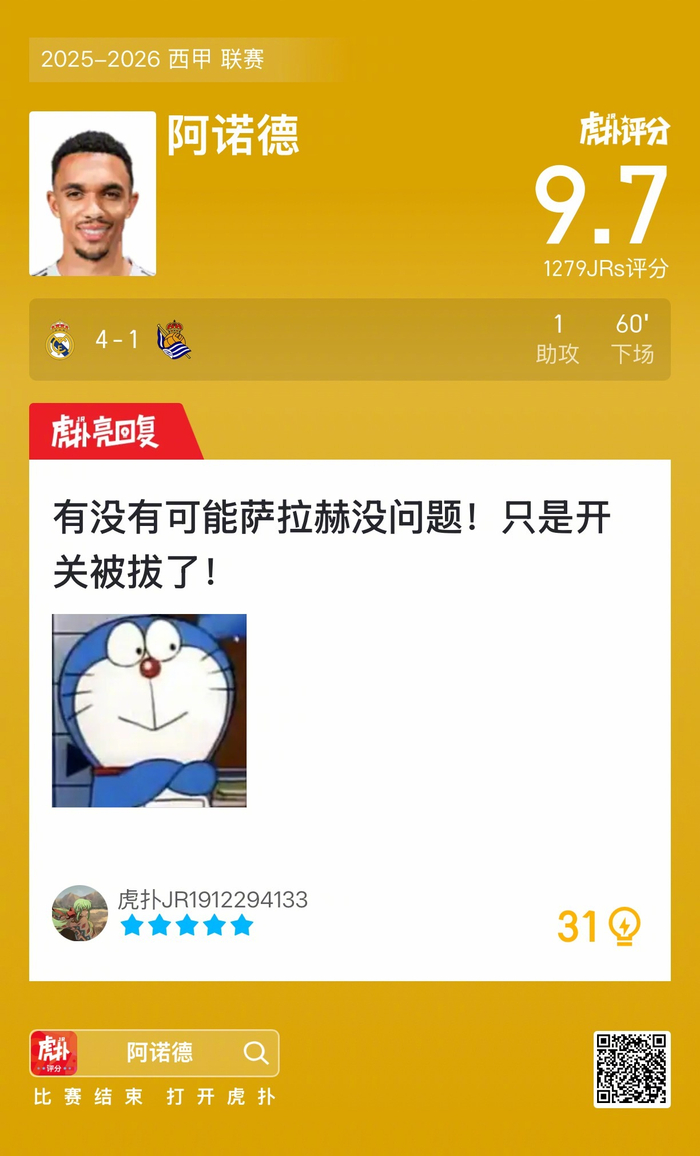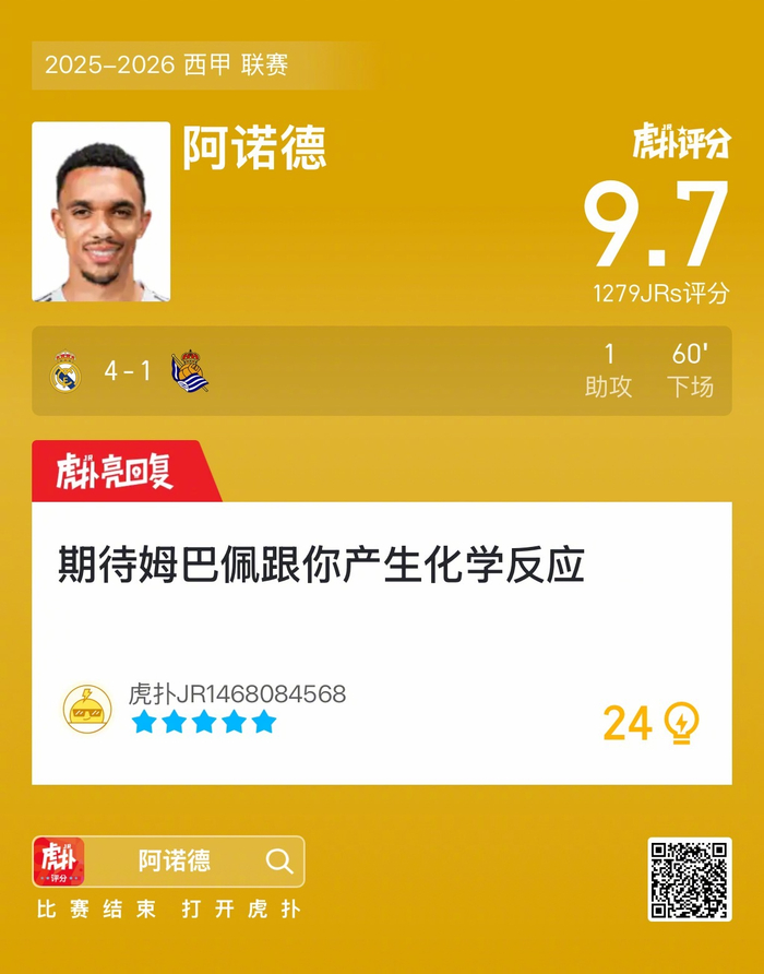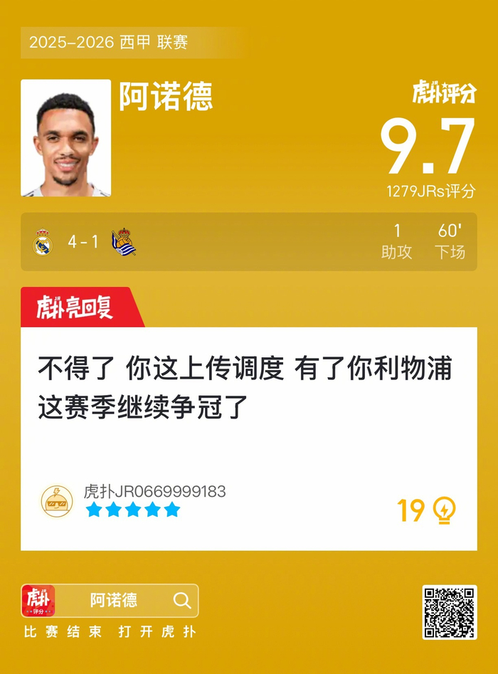 #皇马4比1皇家社会#阿诺德贡献一次助攻,赛后收获9.7的虎扑评分!