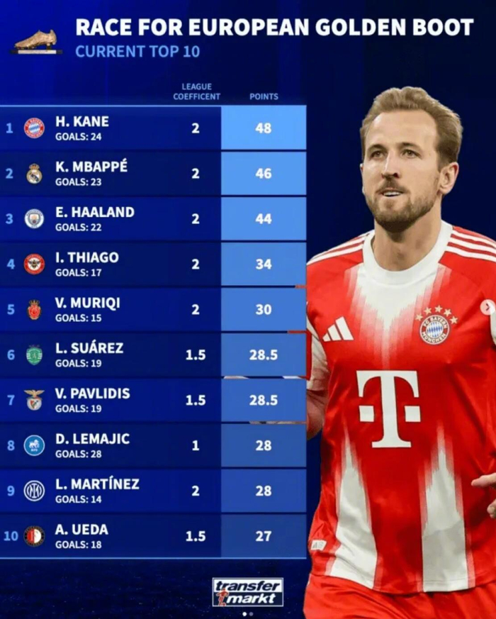 德国转会市场统计了本赛季欧洲金靴目前的积分情况,详情如下: