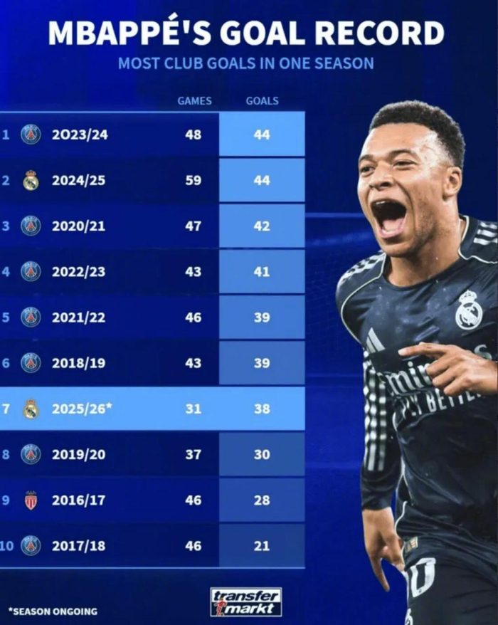 7、25/26赛季皇马,31场38球(尚未结束)