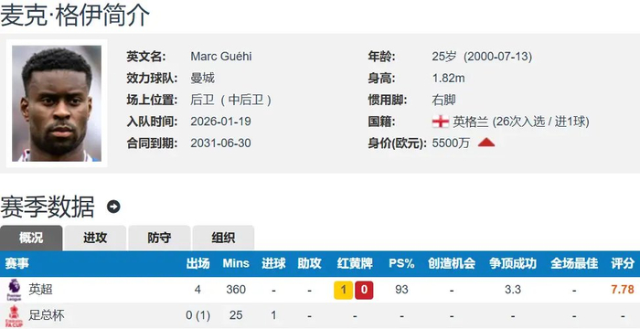 25岁的格伊身高1.82米,司职中卫,德转身价5500万欧元,与曼城签约至2031年。加盟之后,他首发出战了曼城全部4场英超比赛,球队取得3胜1平(击败利物浦、狼队、富勒姆,战平热刺),再加上本场足总杯破门,格伊新援生涯至今5场比赛4胜1平保持不败。