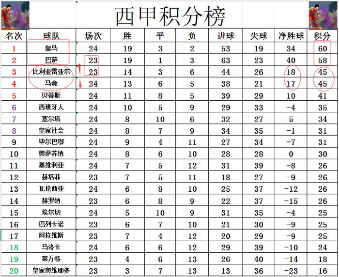 积分榜方面,皇马昨天大胜后,先赛的情况下超过巴萨2分登顶。马竞今天客场惨败给保级弱旅,遭遇2连败,近3轮只拿到1分,已经是落后皇马多达15分,基本上已经是退出争冠。随着马竞惨败,比利亚雷亚尔净胜球超过马竞1球,躺着升到第3。