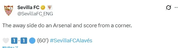 塞维利亚官推在更新比赛比分时揶揄了一把阿森纳,他们写道:“客队(阿拉维斯)像阿森纳那样,打进了一粒角球。”
