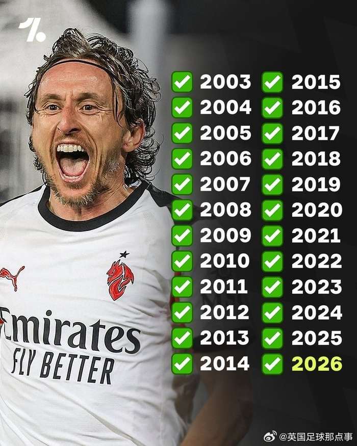 常青树!OneFootball:40岁的莫德里奇连续24年破门,从2003年到2026年从未间断🍷#比萨1比2AC米兰#