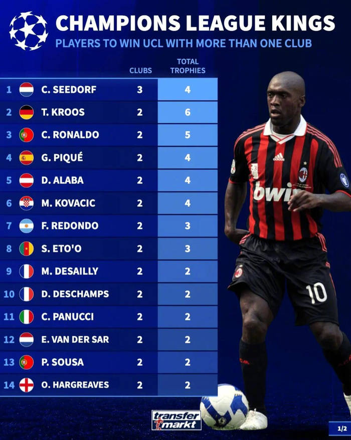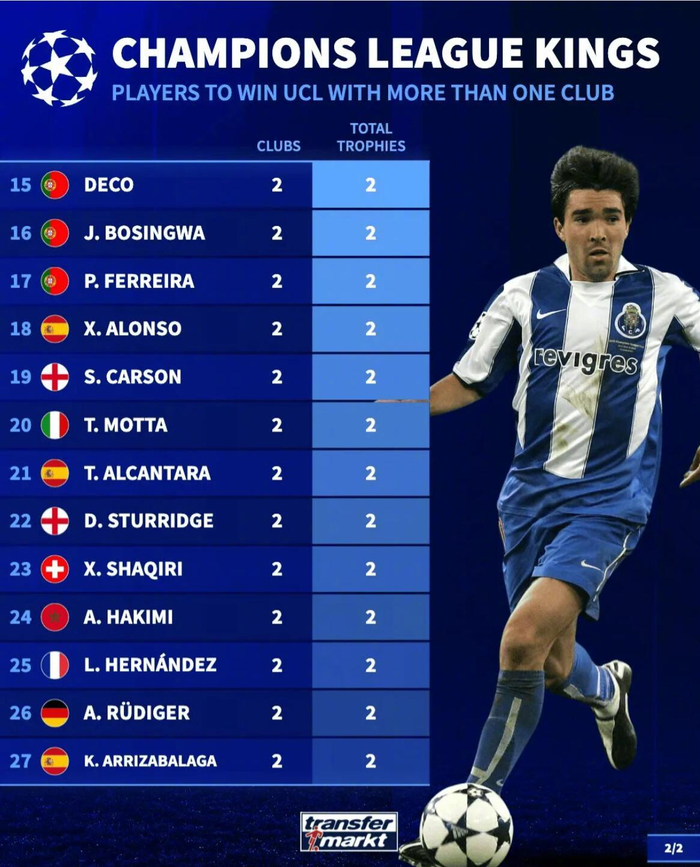 德国转会市场盘点了跟随过不止一家俱乐部获得欧冠奖杯的球员,详情如下: