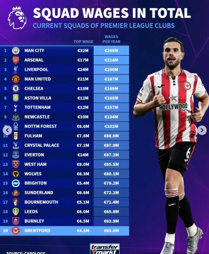 德转统计了本赛季英超球队年薪榜。